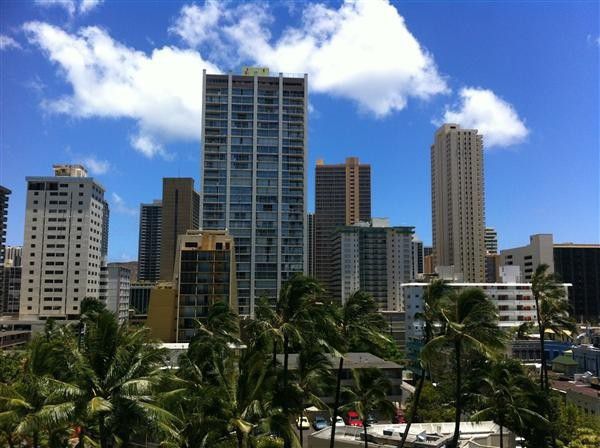阿明送我们到酒店前, 先到DFS帮我们每个人办了购物卡,然后陆续将我们送到酒店。这次我们选择的是Ohana East Hotel(东怀基基欧哈那酒店)150 Kaiulani Avenue Honolulu, Hawaii 96815-3292,酒店的地理位置不错,在KUHIO AVE.与KAIULANI的交叉口,附近有ABC超市、KFC(营业至23:00)、汉堡王 (24H营业)。需要通过两条窄窄的电梯到酒店大堂(二楼),房间内有免费wifi,但信号时强时弱不太稳定;电视机是台式机,有一个中文频道,我们到 时,前客刚退房,房间还未打扫,我和LG边等待服务员打扫房间,边感受hawaii的好天气,给我们打扫的服务员正好是中国人,我们便聊了起来,她来到夏威夷9年,是广东人,在酒店一天需要打扫大约18~22间房,旺季时更多,每天连续工作8h,30分钟用餐时间,工作强度比较大。