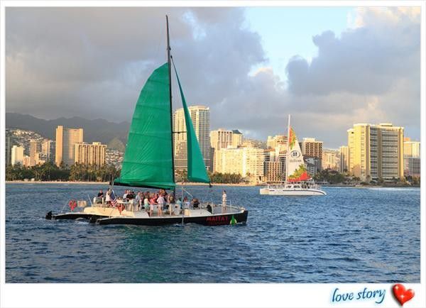 顺 利采购完回到酒店卸货,休息片刻,便出发去Ali’i Kai爱之船晚宴巡航,17:00在 Hyatt Hotel门口候车,有专车送到码头,虽然车上的人来自世界各地,语言不通,但车上的导游很会调动整车人的气氛,这位黑人小伙子喜欢用不太流利的中文告诉 大家:我叫帅哥!接着模仿猫王双手从两鬓划过,引得游客哈哈大笑……上船前导游会给每位游客发放饮料券,每人可点一份价值6或8刀以下的饮料或鸡尾酒,如 价格超过,补个差价就行,味道还不错,鸡尾酒颜色很漂亮。船上的座位划分为靠窗与不靠窗,不靠窗的价格相对便宜点儿,在船的中间摆放着长长的桌子,自助餐 就在这里取食,两头都可以排队,挨着个拿食物就行,品种大概十几种吧,味道一般般,吃的是异域风情。