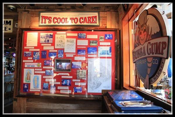 大 约16:30左右,我们便出发前往4F的布巴阿甘虾馆,汲取昨天在Hy’s点菜尴尬的教训,昨晚花了不少时间在官网看菜单,研究今天到底点些什么,功夫没 白费,今天很顺利,点的菜还都不错。布巴阿甘虾馆是以奥斯卡获奖电影《阿甘正传》为主的主题餐厅,布局和摆设与电影情节密不可分,气氛也轻松,我和LG觉 得这儿比昨天Hy’s轻松自在多了。