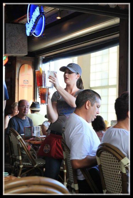 桌 上会摆放铁桶,桶里有纸巾、辣酱、番茄酱等调料,根据口味,自己添加即可。桌上的铁牌很多人会举起相机对着拍,run forrest run代表请勿打扰的意思,stop forrest stop代表我需要帮助,不过负责服务我们这桌的小伙子Tim好像不按章出牌,经常会跑来问我们是否需要帮忙,食物味道如何等,服务周到的小伙子,令我印 象深刻的是,点菜时,他会蹲在桌子边,与我保持同一高度(我坐着),顾客感受很好。