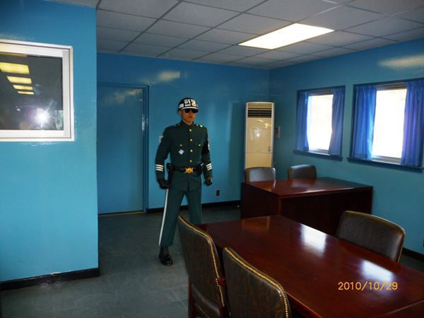 从这一刻起,偶正式成为从南北两个方向都进入过板门店的人啦!四下打量了一会儿,才确定这正是三年半以前自己进入过的同一间军事停战委员会会谈场。现在我们进来的这一扇门就是当年由两名人民军守卫不让游客接近的那扇,左边有一个立式空调,墙上的镜框里是联合国军各参战国的国旗。而当时从北方进来的门,现在有一个韩国士 兵挡在前头――和在外面站岗的士兵一样的装束和站姿:深绿色制服、钢盔、墨镜,两手握拳,两腿分开齐肩,身体微微前倾,仿佛正蓄势待发。戴墨镜看似很严 肃,还有一点神秘感,其实也可以理解为年轻士兵在不得不面对游客把自己当动物园的猴子一样地围观时的一种自我保护措施。导游向我们强调为保障安全不可以靠 近,更不能走到这位士兵的身后去。郑重其事,说得好象一旦走过去就会有朝鲜人民军突然跳出来抢人一样。