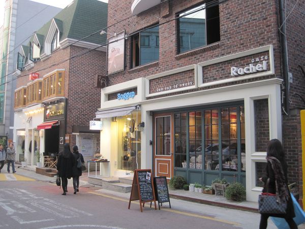 信步而走,我们来到了酒店周围的大学区,街道两旁的商户明显多了起来,而且几乎每一家都装修得非常漂亮而有特色,没有任何的重复,整体感觉又很谐调。又发现一个特点,咖啡馆在首尔异常地流行并且很多,密集之处不出10步就有1家,几乎每家生意都很好。仅仅从咖啡馆、服装店、餐饮店的装饰风格来看,韩国人对于形象和美感的把握确实是非常重视,而且很善于此道。在大学区逛街,光看一路上的建筑就很养眼,很享受了。