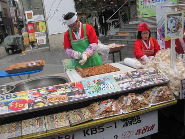 到了晚上,灯光印衬下,城市的繁华感觉逐渐浮现出来,不过吸引我们的,却是大路小路两旁都有的,一辆辆亲切的小吃车。就是韩剧中那些温馨的路边摊,也就像国内城管眼中的那些“叨民摊”。这些首尔的 小吃车很受欢迎,不论男女老少,都会去点上一份炒年糕或是糯米肠,填一下肠胃、满足一下嘴巴。我们也点了一份炒年糕,2000韩元,坐那小凳子上,边吃边 看着各色行人的来来往往,感觉路人与摊主,城市与小吃,不需要城管,也可以那么和谐地相处着,不由又让我回忆起儿时学校门口的零食摊,搅搅糖。