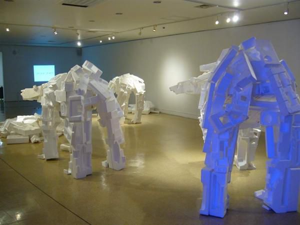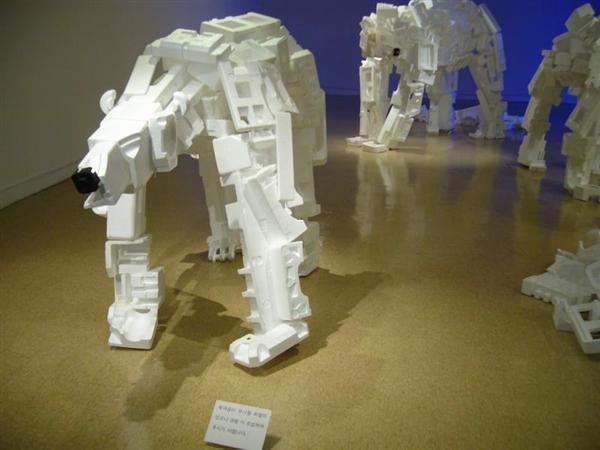 还参观了釜山的一座小美术馆,正在展出后现代艺术,用包装电视机的破纸壳箱子,做成几个北极熊;用螺丝刀加投影,在屏幕上演绎游动的鱼儿。规模不大,观者多是学生和同好者。