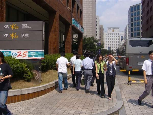 在首尔的金融区溜达时,我偷拍了一些白领午休的样子,女生都化浓妆,脸上抹得厚厚的,男生一般都着西装领带。手里一般捏着烟或端着咖啡,谈笑自若。
