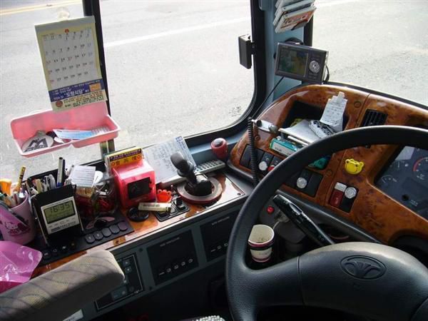 在韩国坐的两台大巴,冷气都特别强劲,尽管外面是30度左右的天气,但只要进到车里,立即就能感觉到很凉快。司机的驾驶台上,设备也很全。