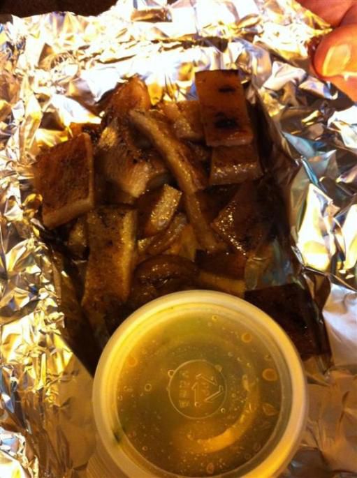 烤猪皮:街边小摊的小吃,乍看以为是烤鱿鱼。蘸上芥末汁吃,筋筋的有嚼头,香香的不腻还有一点甜甜的味道,吃了一次不过瘾,临走前晚上又吃了一次。但要注意的是必须趁热吃凉了有点硬。