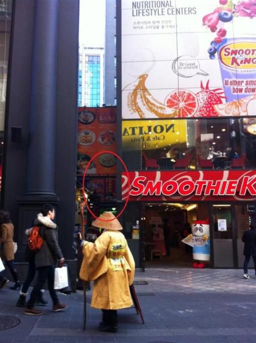 石锅拌饭:明洞的全州中央会馆是个老字号,它的拌饭色香味俱全,你们见过这么漂亮的拌饭吗?走在明洞大街上看到这位戴斗笠的老爷爷就到了全州会馆了,这是他们的吉祥物,呵呵。注意,饭馆在巷子里啊(红圈)。
