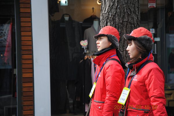 韩国人一般不搞价,但是他们知道中国人爱搞价,所以也习惯了,你最好拿出韩元现金,这样搞价成功几率大。在韩国主要景点和购物区有时能发现穿这样制服的女孩子,他们就是免费翻译,要是你英语不灵光就可以找她们,不过要看清制服上的字,是什么语种的翻译就会写上什么文字。韩国人都很热情,大胆问吧。