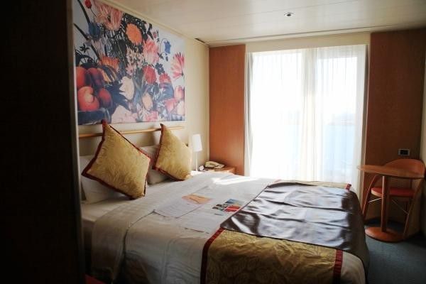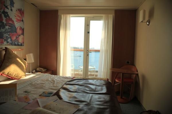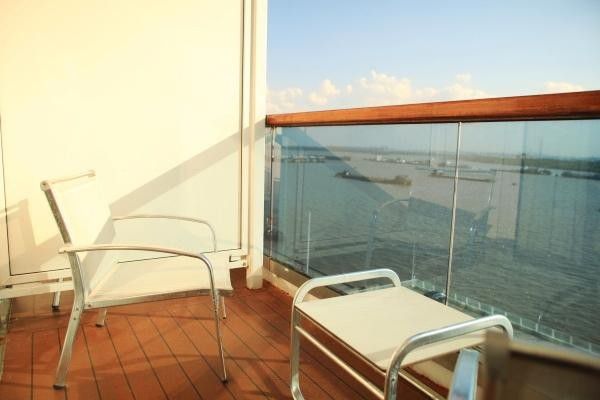 阳台上还很贴心的放了两张大桌椅让你晒日光浴看海 阅读 。不过这个很大的双人床 如果是情侣来的话 就更给力了。咳。太浪漫了吧 床上体贴的放了整艘船的介绍安排 还有整个旅行的行程 和 具体时间