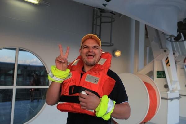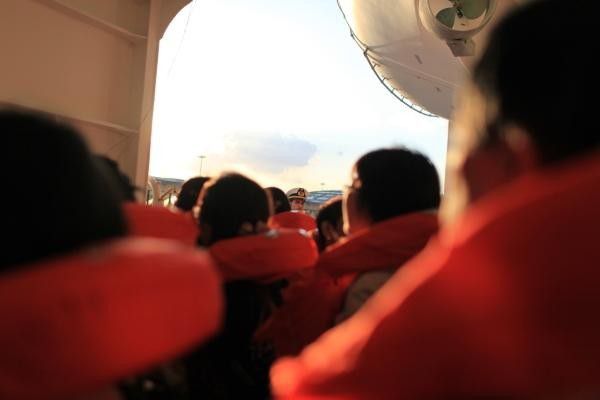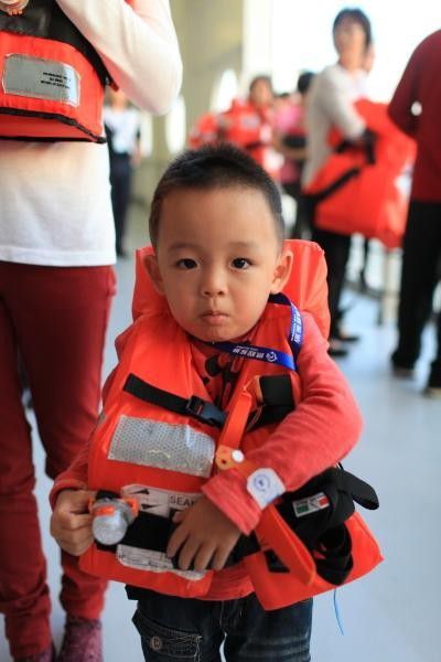 办理好这一切船上也开始在广播 让大家在房间拿上帮我们准备好的救生衣 到指定地方开始做救生演习训练。这个时候才发现 即使过了假期 人真的还是很多啊 老人和小孩比例比较多 主要邮轮也确实适合全家一起出游。指导我们的几个船员都是很有活力的年轻人有几个还很帅