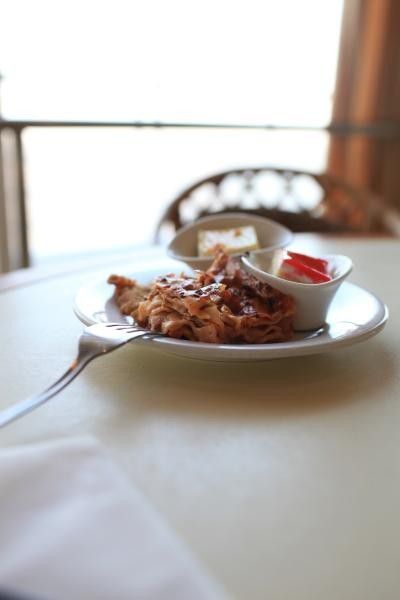 晚餐我们没有选择自助餐而是去的西餐厅会有配好的菜系和甜品水果套餐让你选择 每人一份 桌上的酒是需要付费得哦 其他都是免费的 就餐期间 会有笑的有点傻不过很可爱的穿着水手服的大男孩来和你合影 照片可以选择要也可以选择不参与合影整个吃饭的氛围很舒适并且不喧闹