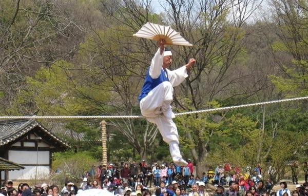 最让人叫绝是一位老者。他手拿一把折扇,在离地2米左右的软绳上灵巧的走来走去,变着花样在绳上做着各种各样的动作。一会儿单脚立绳,一会儿侧臀坐绳,一 会儿又是绳上跳舞,种种惊险表演引来观众阵阵的惊呼声。民俗村的表演还有很多,那烦琐的传统婚礼、轻盈优美的跳板都使我们留恋。置身于这欢乐的场景,似乎 我们也已经融入了这古老而愉快的韩国农村。