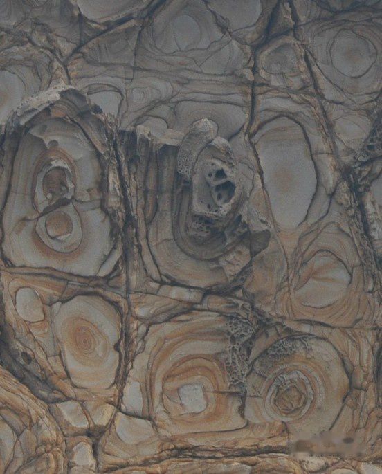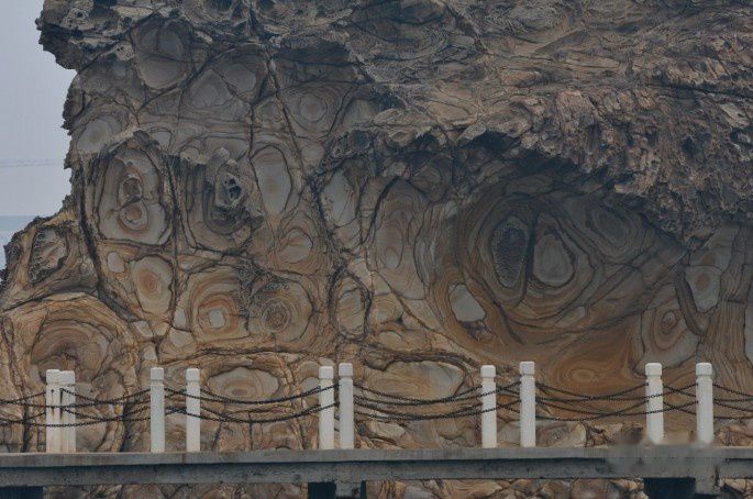 在写青岛前先补一下烟墩角附近的花斑彩石,看了照片你就理解了为什么不和天鹅放在一起,虽然与天鹅在同一个海湾,不知你感觉如何,反正我看了浑身直起鸡皮疙瘩,这块斑纹奇特的大石头是我国18000公里海岸线的唯一有五亿年历史,由火山喷发的火山岩――凝灰岩形成的