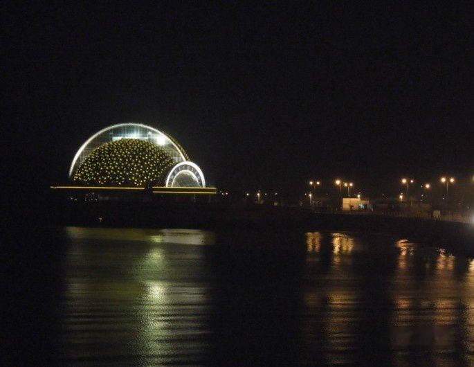 与栈桥隔海相望的建筑晶莹剔透,大球携着小球,在大海的夜幕中,在昏暗路灯忖托下,显得格外耀眼生辉。