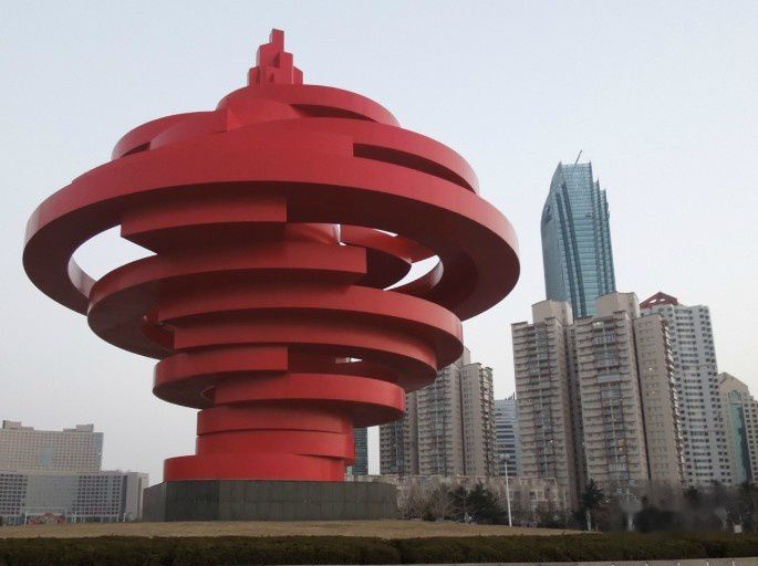 五四广场很有气势,想象一下站在市政府大厦楼上看火红的巨型雕塑,背景是辽阔无垠的碧海蓝天,飘着姿态万千的白云,有海就是不一样呵,左下角就是市政府大厦。