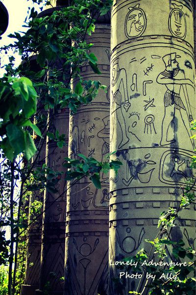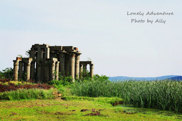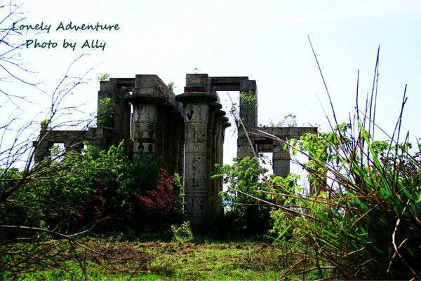 这里杂草丛生,人迹罕至。靠近“金字塔”和神庙的湖边,这个地方叫大庙咀,这些建筑是在十几年前修的。刚开始听说准备开发成一个像深圳世界之窗那样的旅游景区,由于交通不便,也没人投资修路,建了一半的建筑后来就废弃了。平时除了当地农民,只是偶尔有人来拍婚纱照。(摘自百度百科:http://baike.baidu.com/view/10041562.htm )
