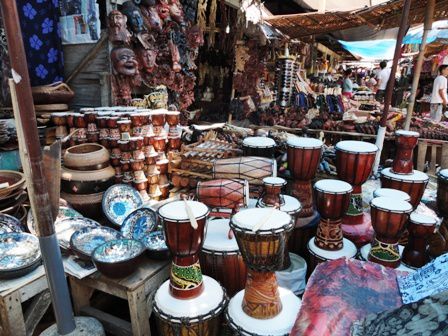 之后去了皇宫旁的传统市场,个人觉得的确没必要在这里浪费太多时间。东西的质量不高,商贩的叫价及态度也让人感觉很不好。我们在这里买了两个手工钉珠的钱包,送妈妈的。叫价150,000rp一个,最后30,000rp成交。还买了一根银手镯,叫价200,000rp,40,000rp成交。但之后我一直觉得那不是纯银的,有点泛黄,在市场里根本看不出来,应该是有其他杂质的银。去之前我就说了要买个手鼓回来,所以一直在寻找,市场里很多大大小小都有,但音质不好,用作装饰还可以。其他逛了两家专门卖乐器的店,看上了其中一家更专业一点的。只是讨价还价的过程太辛苦了~~~1650,000rp的价格最低1450,000rp,我觉得贵了,无奈只能退而求其次选择另一支便宜点的,1250,000rp的最后1075,000rp成交,整个过程耗时1.5小时。Honey实在看不下去我和老板的互不相让,最后妥协在老板开出的1075,000rp。我在丽江买的600的手鼓这边价格差不多是300多。爱鼓之人有福了!呵呵!