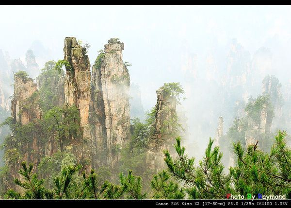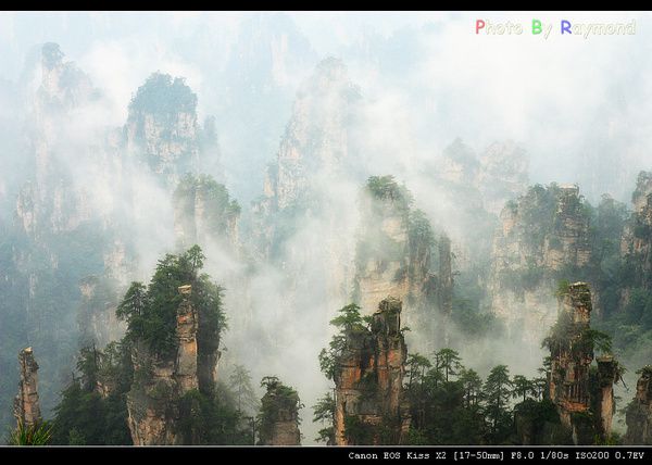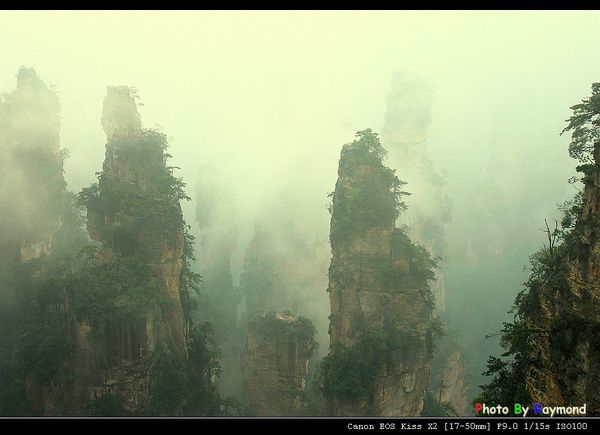 一路向下,石板滑得惊心。还未到观景台就听见人声喧嚷,有惊喜的叫喊,也有期待回声的呼唤。终于来到平台上,雨雾迷蒙中,石峰丛若隐若现,宛如仙境,此景的确很像《阿凡达》里仙气飘渺的悬浮山群。这里没有护栏,和峰林的距离又很近,小心翼翼地靠近边缘,向下张望,不禁有种摄心夺魄的紧张。