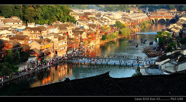 晚上十点半,坐上车八个小时后,在一片黑暗中终于看到了属于繁华的光亮,凤凰在那里。辗转一倍的路程,我们终于到了。原以为接近子时的这里应该趋于宁静,可是走进古城的时候,才发现一切活色生香似乎都才刚刚开始。