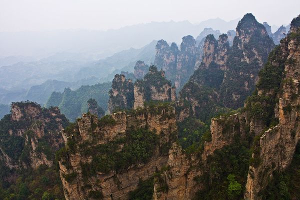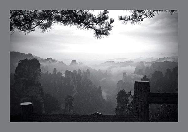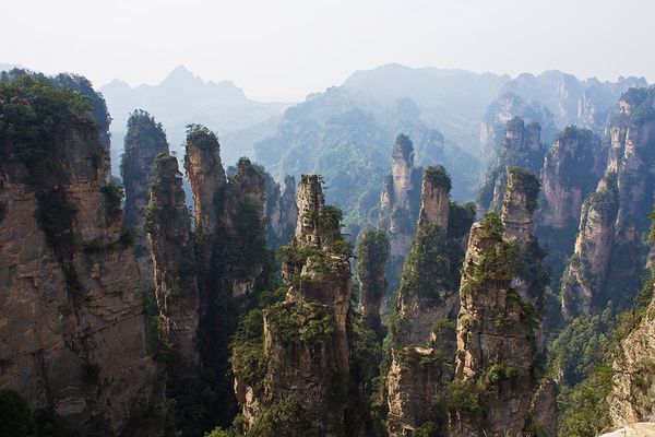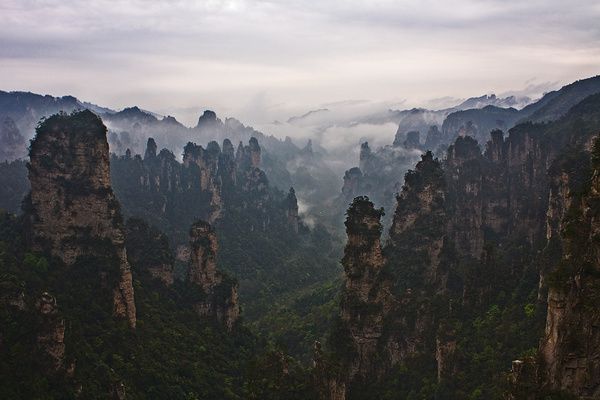 4、当天下午一直下着小雨,等我们安排好住宿雨也停了,老板劝我们赶快去大观台,能看到云海。我们赶紧放下行李奔大观台而去,走了10多分钟到达大观台只见远方云起云涌,群山在云海中变换着身姿。这时已经是下午5:30了,我们实在不想错过云海观山的机会又下了600级台阶去到神鸡啄食,在那里能看到十里画廊。这时景区只有我们三个人,周围很静没有游人的喧嚣,只有大自然的风声,看着远处一根根的山柱在云海里忽隐忽现,觉得自己仿佛置身在仙境中!我们又去了一步难行因为在神鸡啄食那看到的景色印象太深刻了,感觉这的景色一般。天上又响起了雷声,因为怕再下雨,我们只好离开了景区。