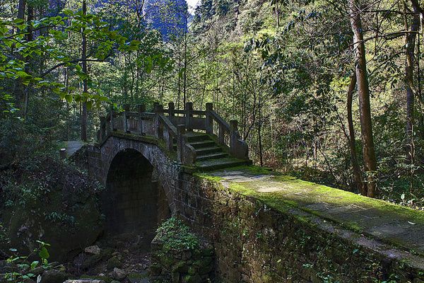 2.游完望桥台后朝刚才乘车相反的方向沿公路走50米,即到砂刀沟入口处。要特别推荐下这个景区,之前在网上看到的都说这里阴森森,不建议走。但一路走下来却觉得风景这边独好,首先路很好走,不象有些网友传说的那么艰险。从入口处下到沟底都是石板台阶路,大约走了40分钟,下到沟底就是森林管理站,这里常驻有工作人员,过了森林管理站后都是青石板路只是有一段路苔藓较多,有些滑,在景区里面看到介绍说整个路是由香港人士出资90万元修建的。因为走的人少景区里很是清静,沿着潺潺的溪流看着满眼的绿色呼吸着新鲜的空气经孔雀开屏、清心潭等几个景点便下到了金鞭溪的擂茶馆,沟底我们走了1个多小时。