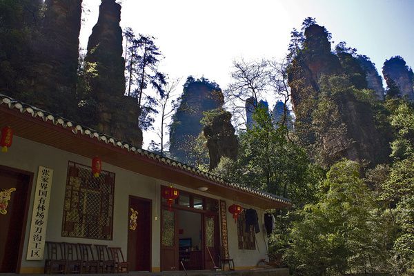 在天子山门票站买了门票后,坐免费环保车,20分钟到终点站下车(三叉路口),往左手方向丁香榕前进3分钟,后再往右手方向(旁边有发电箱方向),继续前进走进去5分钟就到了丁香榕村。在环保车上和澳门来的一对小俩口组成了临时三人组,在景区的几天里我们一直同行。