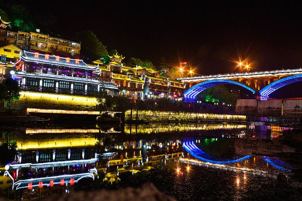 2,晚上6点多钟到达凤凰汽车站,下了车前面就停着一辆1路公交车,车上的人基本上又都上了这辆车。凤凰的公交车不报站名也没有站牌,一车的人坐的都是云里雾里的。还好,在南华门那站时终于报了次站名,车上大部分人都赶紧下了车,我下车后直接走过南华大桥,因为背着大包,我也不想走太远,就想在老营哨街那找家客栈,下了大桥在栗湾停车场大桥下找到一家鑫鑫客栈,看了看条件不错,因为是非周末,标间砍到了50元/间,安顿好后向老板娘咨询夜市怎么走,老板娘很热心的告诉我不要去古城里面的夜市,去新城的夜市,那儿基本上都是当地人吃,价钱便宜些。按照老板娘说的路线:出了南华门走到丁字路口向右转沿着桔园路就走到了,大约走了十分钟,在夜市上转了转找到一家叫三姐螺蛳的摊位,看到当地人很多,我也学着他们要了份螺蛳和大骨汤还有炒饭,果然很好吃啊。后面两个晚上我也是在那儿解决的晚饭。吃过饭悠闲的走回来再次经过南华大桥,从桥上眺望古城才注意到凤凰的夜景很是迷人璀璨。