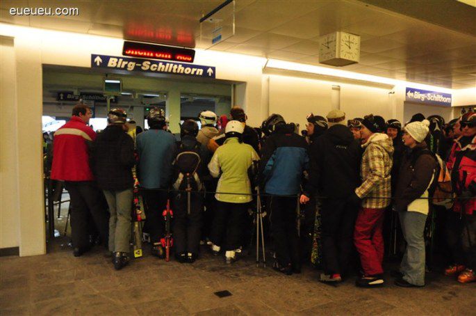 先说少女峰地区吧,少女峰滑雪场是瑞士最著名的滑雪场之一,也被评为世界十大滑雪场。说实在的,当我们到了Lauterbrunnen时,我还没有决定去滑雪呢,但周围人不论是老人还是孩子,人人手里都抱着雪具,我实在按耐不住了。下图是去雪朗峰的缆车,人人都抱着雪具,若是你什么都不拿,会不会感觉不合群呢?呵呵...
