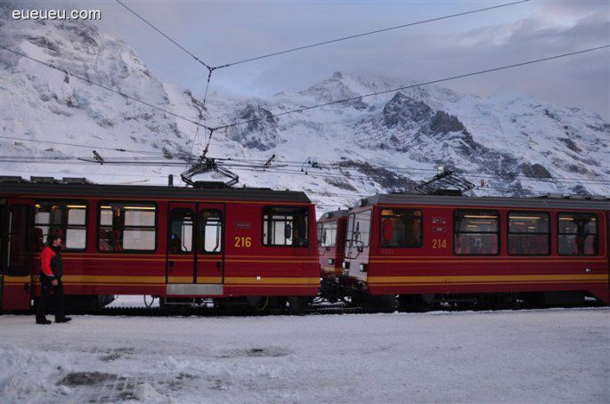 少女峰地区其实有四座通了交通的山峰,分别是少女峰,雪朗峰,First和Mannlichen。少女峰是欧洲最高峰,也是欧洲最高的火车站所在,从茵特拉肯有两条登山火车线,分别从Grindelwald和Lauterbrunnen经过。在KL. Scheidegg回合,转乘红色小火车登上Jungfraujoch。