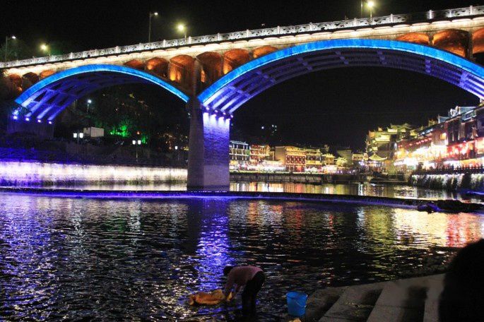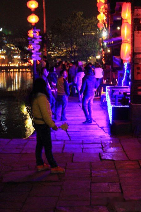 吃完晚饭再沿沱江走走,风凰的夜景很美,沿江的酒吧也变得热闹了,音乐声和灯光在沱江上空交织。风凰的酒吧相比丽江更喧闹,酒吧的工作人员在门外就开始像行人吆喝着。流行音乐,炫人的5色彩灯从酒吧里弥漫到大街。