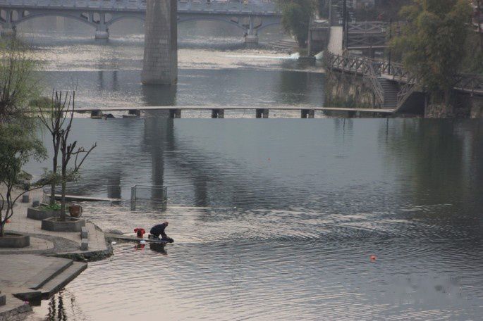 沱江上的跳岩古朴有趣,不仅有潮涨潮落的情趣,而且时常有苗家姑娘背着山货飘逸行走的风景。桥岸那一溜清光岩石铺就的码头,整天不绝的棒槌声,嘻嘻哈哈的喧闹声,汇成了女人们世袭的乐园。