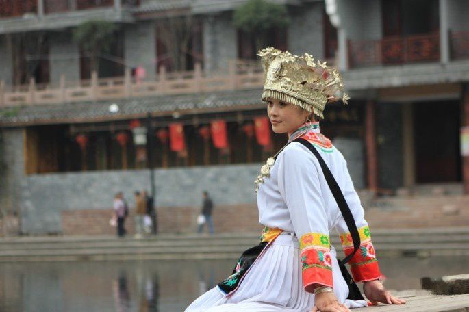 沱江北门外的跳岩是游客拍照的热门点,化10元就能租一套苗族服装。跳岩一带常能拍到身着苗服的美女们。