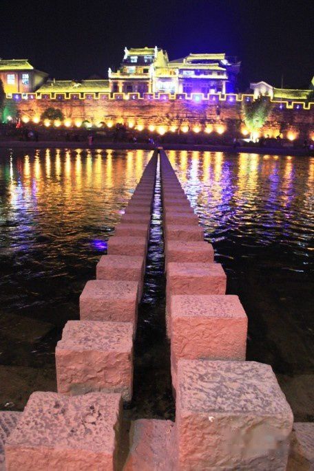 沱江跳岩始建于清康熙四十三年(1704年),旧时是进出凤凰古城的主要通道之一。乾嘉苗民起义,辛亥革命凤凰光复起义、解放战争,这里都是进攻古城凤凰的主要通道。跳岩全长100米。共有15个岩墩,依次横列在沱江河床上。岩墩均用红砂块石修砌,墩与墩之间相距5米,上面用木板搭铺,木板再用铁链捆牢,固定在河两边的铁桩上,防洪水冲走。几度风雨霜雪,几度沧海桑田,跳岩仍坚固牢实,保存完好,如今不仅是沱江河上人们来往的要道,而且成为凤凰古城颇具民族特色的亮丽风景。
