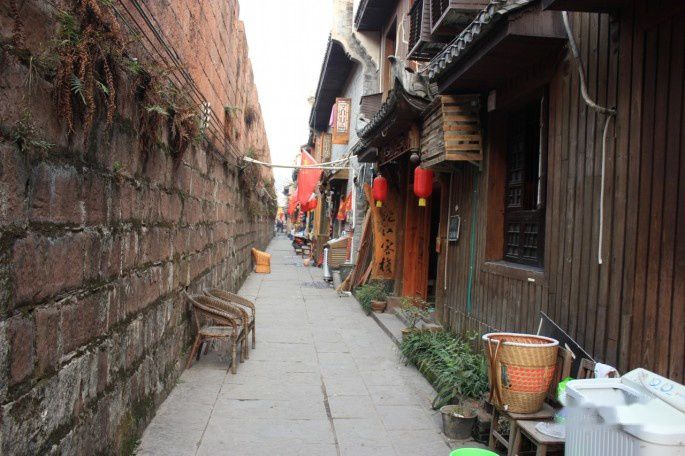 风凰古城里回龙阁一带有许多客栈和店铺。很多客栈是门对古城墙,窗临沱江,