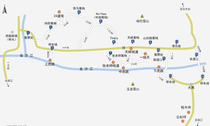 | 丽江→虎跳峡镇→高路→纳西雅阁→24道拐→Halfway→Tina’s | |||||||