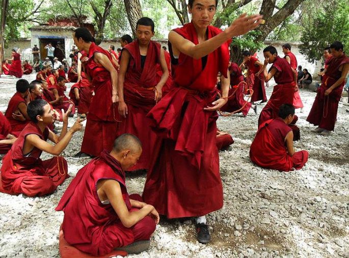 色拉寺最吸引游人的就是每天下午15:00开始的辩经。进山门后沿通道前行,北侧既是辩经场。辩经,是一种佛学知识的探讨,辩论的双方唇枪舌剑,言辞激烈,辩论双方往往会借助各种手势来加强辩论的力度。他们或击掌催促对方尽快回答问题,或拉动佛珠表示借助佛的力量来战胜对方,颇有特色!