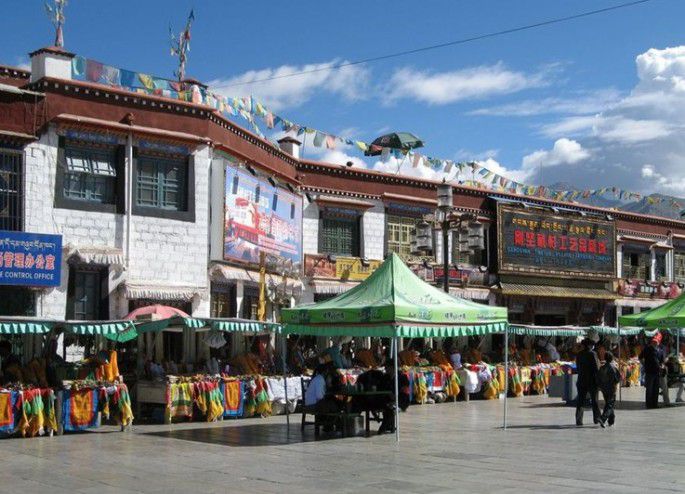 朵森格路北京路路口有大型超市:四方超市。不论是生活用品还是特色食品,一应俱全。要买藏式饰品和纪念品的话,非八廓街莫属。八廓街上有诸多店铺,经营各种佛珠、转经筒、哈达、唐卡等宗教用品和红珊瑚、绿松石、蜜蜡、象牙等材质的饰品,只是记得砍价。