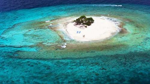 小岛,小岛中央是绿色,四周是白色,离岛近些的海水是浅蓝、水蓝、深邃的蓝,逐次渐层,印度洋犹如一面蓝色的天鹅绒布,缀饰着一串串翡翠宝石。