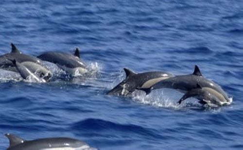 随着第一条海豚飞快地跃出海面,仿佛攀比一样,大大小小的海豚会纷纷跃