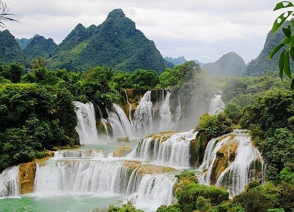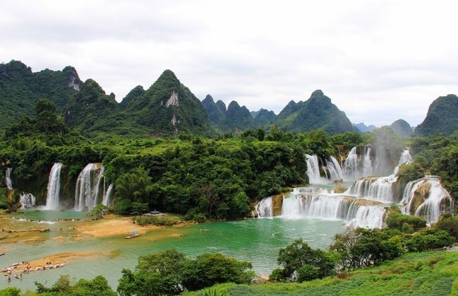 德天大瀑布位于中越边境广西大新县硕龙镇境内,横跨中国和越南两个国家,为亚洲第一世界第四大跨国瀑布。大瀑布气势雄浑,一波三折,层层跌落。归春河从百余米宽的断崖上跌下,如海水倾泻,跌宕50余米,涛声如奔雷回荡于山间,数里可闻。瀑布撞击河谷,水花飞溅,使雾气弥漫山间,在阳光的照耀下,时有绚丽的彩虹出现。德天瀑布旁边几十米远处是规模略小的板约瀑布,属于越南。