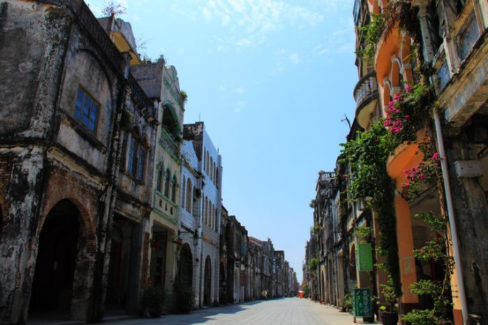 始建于1883年的老街,长1400余米,宽约9米,毗邻外沙岛,是一条充满沧桑的百年老街。街道两边都是中西合璧的骑楼式建筑。古老的门洞,被海风侵蚀的锈迹斑斑的墙壁,卷拱精美,雕线流畅。上世纪二三十年代之前,这里是整个北海最为繁华的商业区,街上店铺鳞次栉比,法英德等国家的领事馆、天主教堂、修道院、洋行穿插其中,熙熙攘攘,车水马龙。