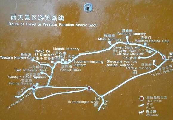 | 佛顶山山顶→慧济寺→法雨寺→普济寺→百步沙→西天景区 |