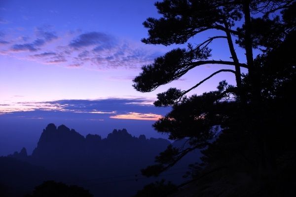 晚上商量好,第二天去光明顶拍日出,其实我是想去丹霞峰拍的,丹霞峰毕竟就在宾馆旁边,但光明顶名气实在太大了,身边的人都想上光明顶看日出,我的打算终于动摇了,去光明顶的路很遥远,第二天4点起床,楼外已经传来四位姑娘上路的声音,简单洗漱一下,然后吃点食物,也匆匆想光明顶进发,一路走来,汗流浃背,路上不时间有人停下来休息,路途中竟然遇见先我出发的四位女孩(黑暗中也看不清楚,感觉而已),其中一个看我爬的很累,大喊,说才走了5分之1的路,听了后人都快晕了,只好背着重重的行囊继续前行。到达光明顶时,天还没有一丝亮,也不知太阳到底从哪个位置出来,大约估计了一下,选择四位姑娘的旁边站好位置,渐渐地,天空中泛出微量的光,远远的那座山上,很多人们打着手电爬在山路上,支起三脚架曝光了这张照片,依稀可见云是涌动着的!