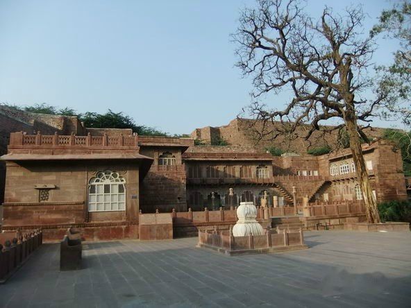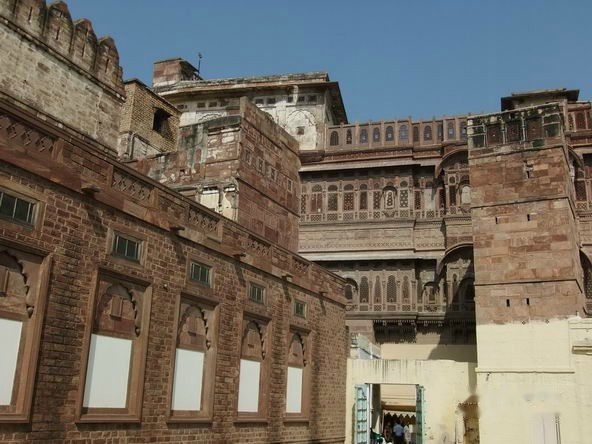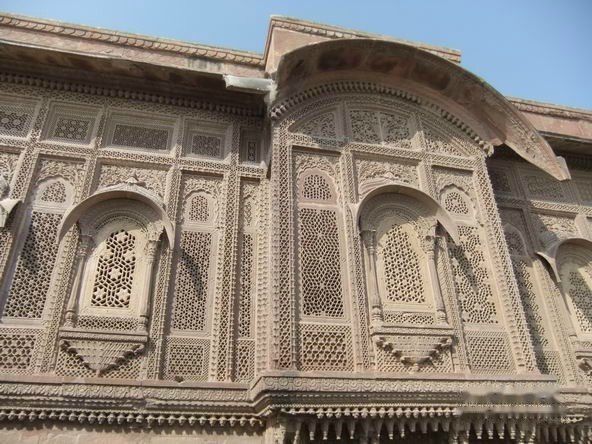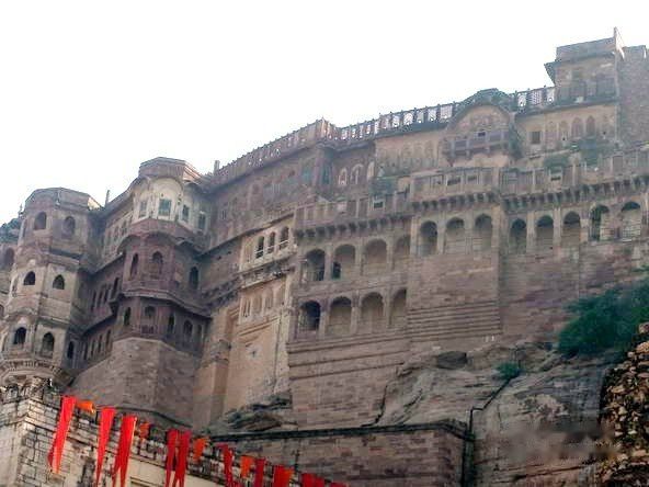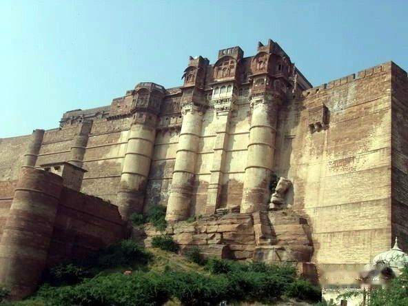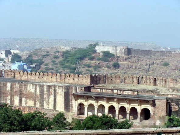 梅兰加尔古堡位于久德普尔旧城区,是1459年久德哈王公建造的。屹立于大约125米高的巨崖之上,古堡建筑采用坚硬的黄色砂岩,周围环绕有护城墙。梅兰加尔古堡拥有七道城门,是由不同的王公建造于不同时期。站在城堡上方,可以眺望久德普尔旧城景观。Mehrangarh的名字来自梵语,Mehran音同Mihir是太阳的意思,Garh是城堡,所以梅兰加尔又称太阳城堡。在城堡林立的拉贾斯坦邦,梅兰加尔堡是最雄伟壮丽的。无论身处焦特布尔城市的任何地方,都能清楚地看到这座30多米高的褐黄色砂岩城墙直插蓝天、屹立于125米的山颠之上和山体浑然一体的城堡。他就像一块巨型磁铁,吸引着你不知不觉走进,去近距离接触其雄姿。