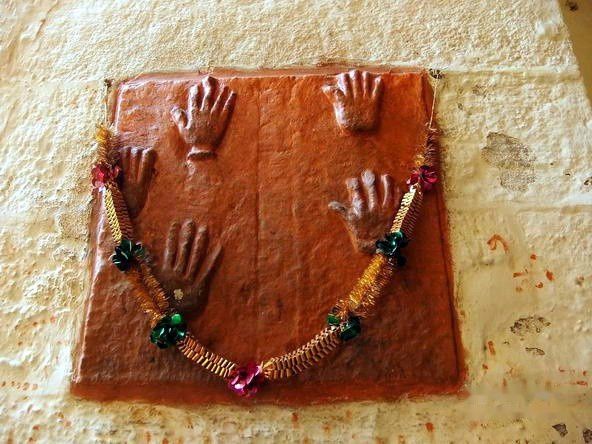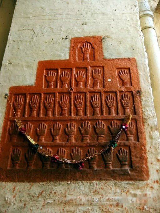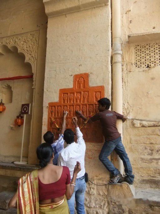在墙上按下红手印,源于拉贾普特寡妇殉焚风俗。每次战役结束,如果丈夫战死,他们的妻子要遵循寡妇殉焚风俗:亡夫火化的当天,妻子沐浴香薰,盛妆华服,将手蘸满红色染料,印在墙上,代表着忠贞,爱情和勇敢。之后坐在由鲜花装点的轿子里游遍全城,在市民的欢呼和簇拥下,到达置放亡夫遗体和泼油柴草的焚化台,在僧侣和民众的诵经声中,让熊熊大火将自己焚烧。仅在1815年至1825年,该类事件就有6000多起。今天,这一切虽然都随风飘去,但那历历在目的血手印,却让人永远难忘。