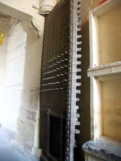 最后一道便是铁门,入口狭窄,包着铁皮钉的大门厚重狰狞,两边高墙投下浓浓的阴影,门后通道故意筑出高高的坡度,以减弱敌人大象群的攻击力,这座城堡还真就从来没有被一头大象攻破过。