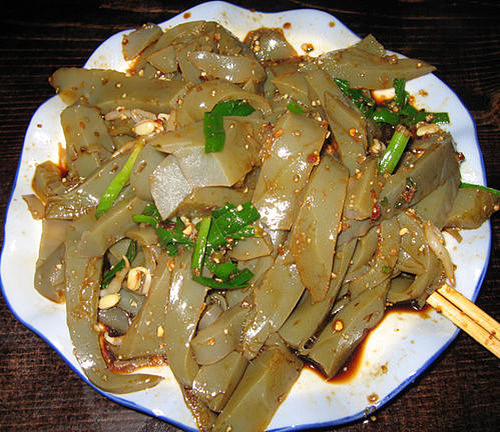 鸡豆凉粉:在古城美食街就有卖的,味道很不错的。像果冻一样滑滑的,口感细腻、加上蒜泥,葱花,酱油,酸醋,辣椒面,麻油等凉拌吃。