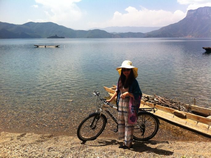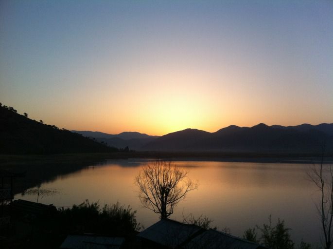 那天晚上,在我们住的枫月荭日客栈,晚上我去帮着烧松果来烧开水泡茶,王哥拿出上好的老茶头来招待我们,我们一起聊天南地北、一起聊生活中有趣的事儿,很晚才回去休息。枫月荭日是个好地方,王哥不喜欢我们叫他老板,他说那是商人他不愿自己是个商人,所以能来这里住的都是有缘人。在这里住需要满足以下要求才行:不能抽烟、不能喝酒、不能大声喧哗、不能**、只能食素。所以在这里住在安静不过了。我现在真的明白了为什么那对母女在那边儿住了一个月还舍不得走又打算再住一个月。到了傍晚,整个女神湾就只有这一家客栈,没有一丝商业气息。看着晚霞、吹着湖风,那真是神仙过的生活。第二天睡到自然醒,收拾完后我们准备出发搭车环湖了。王哥出来送我们,走的时候心里有点儿难受,这些朋友难道真的就只有一面之缘吗,我在心里暗暗告诉自己:我一定会再来!一路出发,搭了四辆车加徒步到达大落水一共用时4个半小时,还算很顺利。在大落水下车时,那位重庆的朋友告诉我们说晚上可能有一位老年夫妇自驾去丽江是一辆丰田的越野让我们去找找看,看下能不能遇上。最后以无果结束,还是买好第二天去丽江的车票找了家客栈住下,放好行李后我们打算去外面转转。那个下午我们看到了最美的风景。