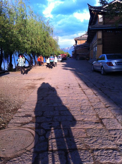 上午我们一路过去的时候还是阴雨绵绵,没想到六七点钟的泸沽湖居然还会突然放晴,夕阳把我们的影子拉得很长很长。